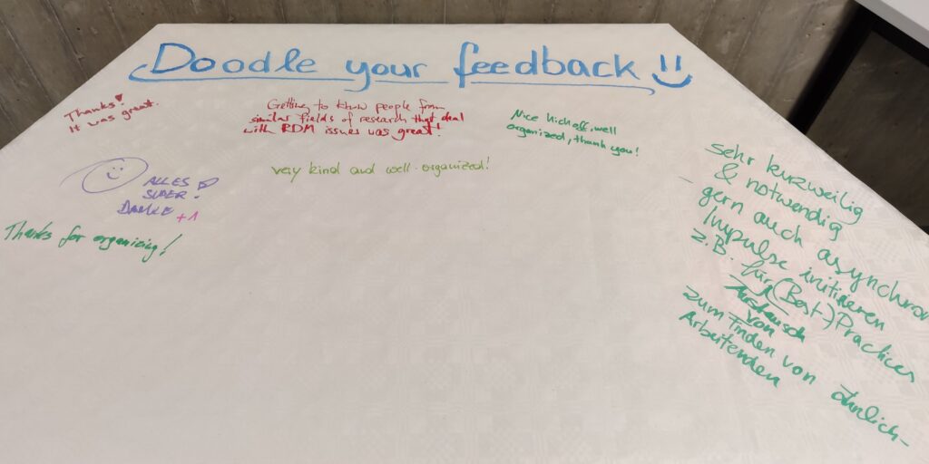 In einer offenen, angenehmen Atmosphäre – unterstützt von Kaffee und Keksen ☕️ 🍪 – entstanden zahlreiche anregende Diskussionen rund um konkrete Herausforderungen im Forschungsdatenmanagement. Dabei kristallisierten sich drei zentrale Themenbereiche heraus, die viele derzeit besonders beschäftigen: